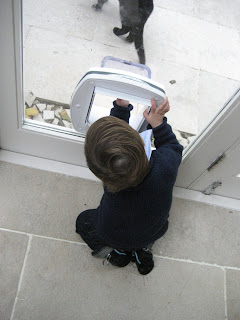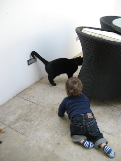 Charlie has become fast and furious (furrious?) friends with Cashmere the cat and can’t get enough of the cat door. He keeps sticking his hands out through the door and Cashmere comes over and nuzzles them. He also sits and looks at her through the door and babbles to her. He also chased her around and around the tables but she finally let him catch her.