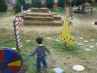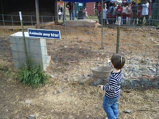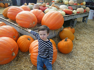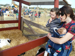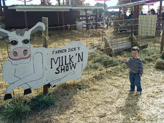 At the pumpkin patch today Charlie really liked the pumpkins, a trough filled with corn kernels, a mulch mountain, and all the baby animals and their mothers. What he was not so sure about were the hayride (with scary witches, aliens, Michael Jackson, and safari animals) and the sarcastic cow-milking-guitar-playing farmer.