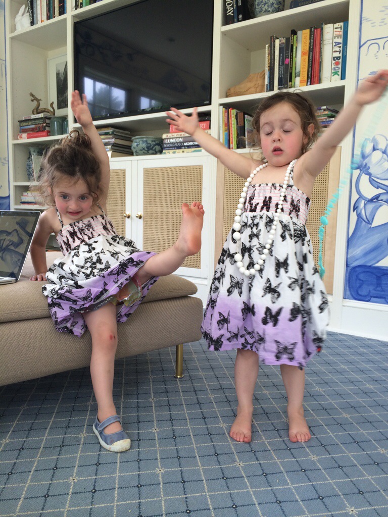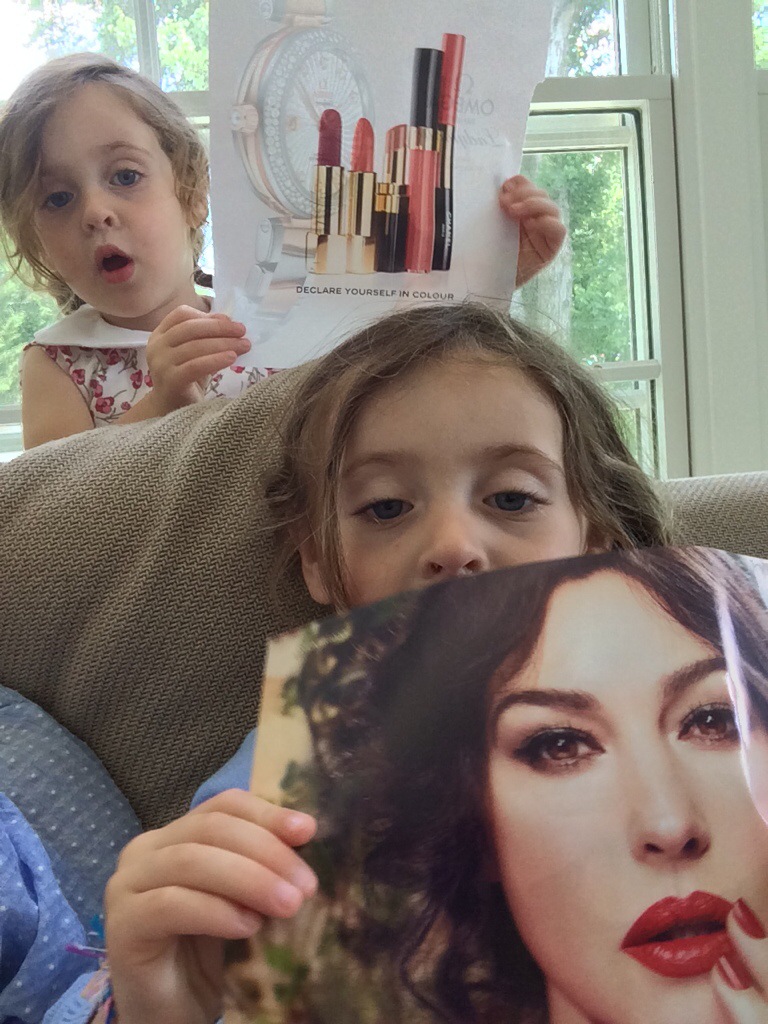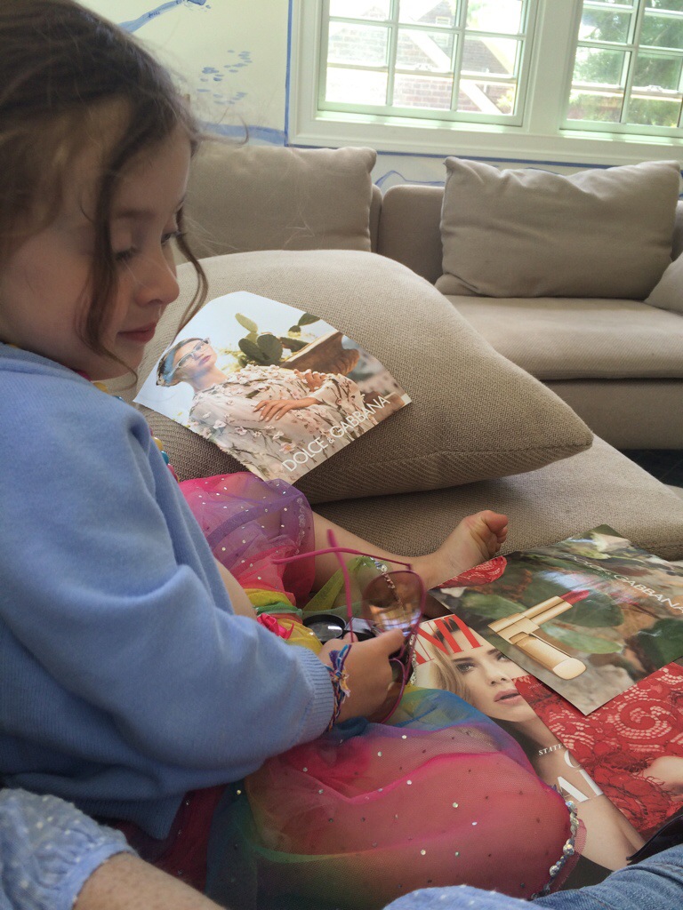 We lounge together on the sofa and flip through the pages of fashion magazines and the girls have me year out the pictures they like-this time a couple lipsticks, some nail polish bottles, a white gown, and flowery glasses. Scottie liked the Dolce and Gabana campaign that actually reminds me of her and Nelly.