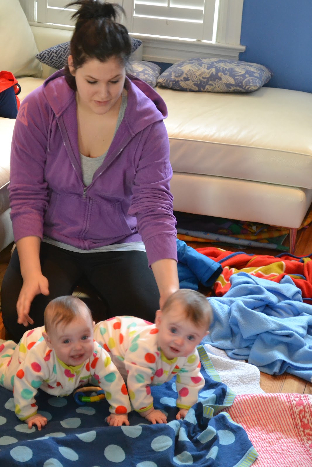 Scottie is trying so hard to sit. She gets so frustrated. The same way Nell was so frustrated a few weeks ago. Scottie does an amazing job doing side plank tho. Her arm, ab and legs muscles must be powerful underneath those cute rolls of chubbiness. (Pictured with beloved babysitter, Emily).